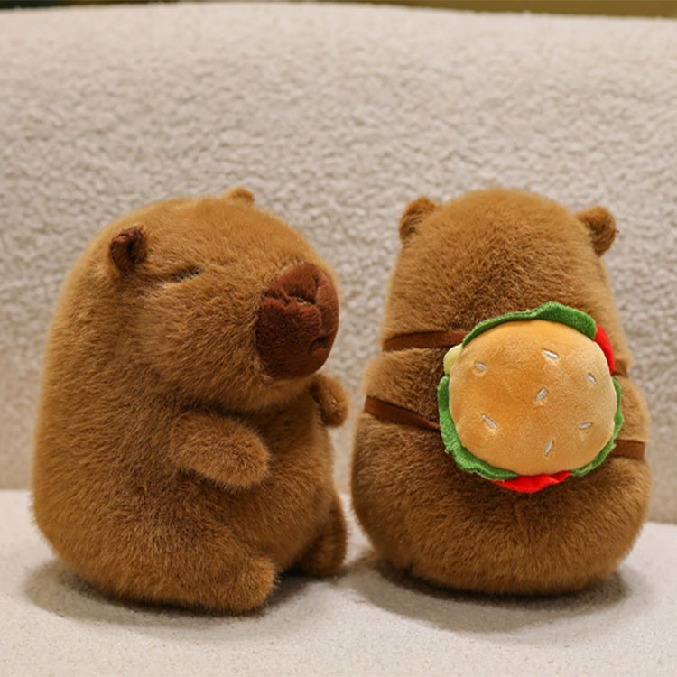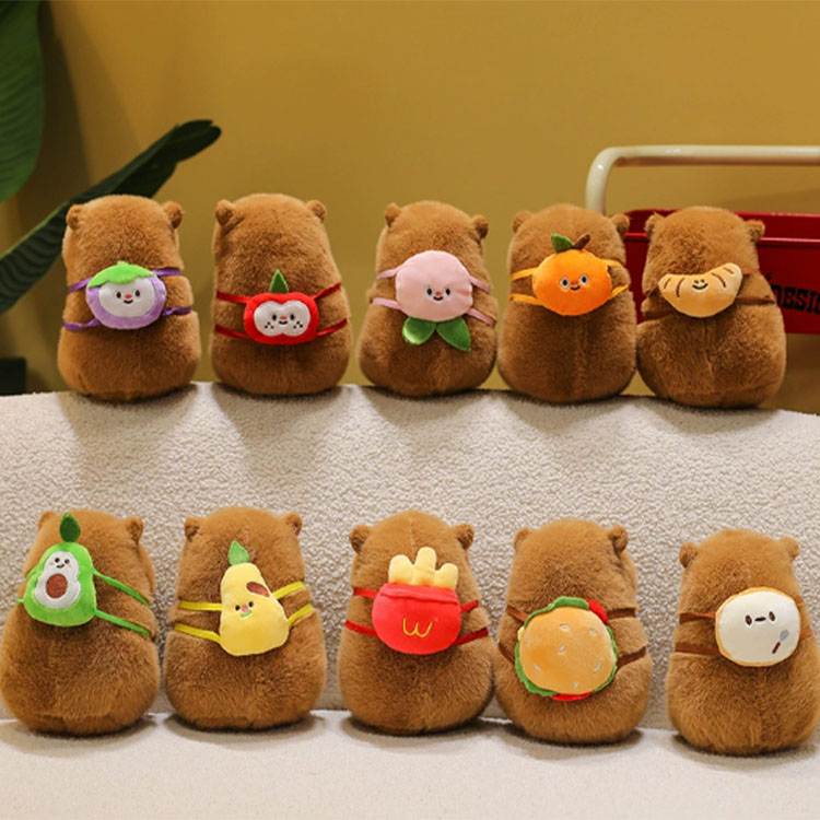 このかわいいカピバラのぬいぐるみ人形は、カピバラの外観を持っています。このシリーズのすべてのキャラクターはバックパック型であり、各カピバラは別のバックパックを運んでいます。ハンバーガーを背中に運んでいる人もいれば、ナスを運んでいる人もいれば、リンゴを運んでいる人もいれば、フライドポテトを運んでいる人もいれば、洋ナシやオレンジもあります。あらゆる種類のカピバラがあり、それぞれがとてもかわいいです。彼らのバックパックは脱ぐことができ、合計10種類のスタイルがあります。そして、それぞれの小さなバックパックは非常に絶妙です。